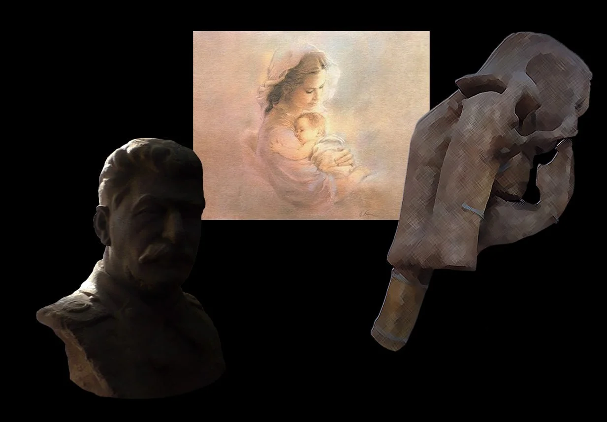 А ведь по-настоящему бюст путешественника Сталина должен был бы быть совсем в другом обрамлении. Этот бюст, освящённый красивой и благородной историей его спасения, должен был бы стоять на фоне черепа мамонта, или слона-предшественника, вроде южного слона, и всё это на фоне рисунка во всю стену Золотой Девы с несмышлёным пока ещё младенцем-паломником на её руках.